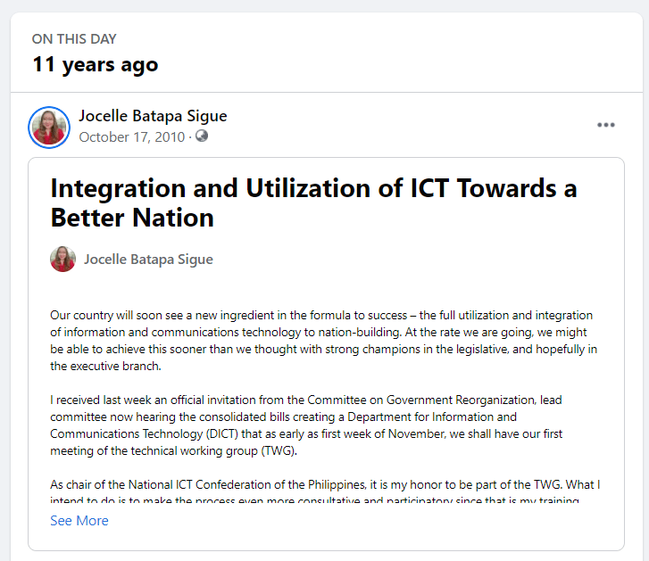 As chair of the National ICT Confederation of the Philippines, it is my honor to be part of the TWG. What I intend to do is to make the process even more consultative and participatory since that is my training ever since.