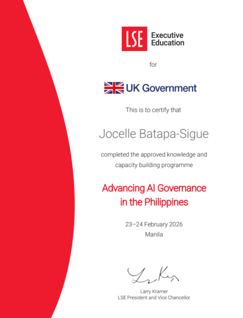 The São Paulo programme also builds on Batapa-Sigue’s growing body of AI governance training. Prior to this, she completed the LSE Executive Education knowledge and capacity-building programme, Advancing AI Governance in the Philippines, in Manila in February 2026, as well as the Alan Turing Institute’s AI Governance Knowledge and Capacity Building training delivered with the British Embassy Manila in February 2025. Taken together, these three programmes reflect a sustained commitment to deepening expertise in responsible AI and bringing globally informed governance insights to Philippine policy and practice.